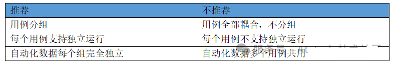 我们一般会将同一个场景下的自动化用例作为一个自动化用例组,组内的不同自动化用例之间可以进行参数的传递,可以进行相互依赖;而不同自动化用例组之间,一定从前置、数据等做充分的隔离,万不可将鸡蛋放在一个篮子里,即所有的自动化用例都只依赖一个前置类或者方法,导致一个用例失败即全部失败。