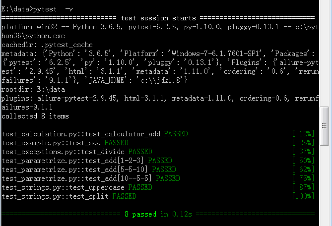 把以上几个程序文件分别存到指定的目录下,cmd进入到此目录,然后执行pytest即可执行这5个测试文件。测试结果如下: