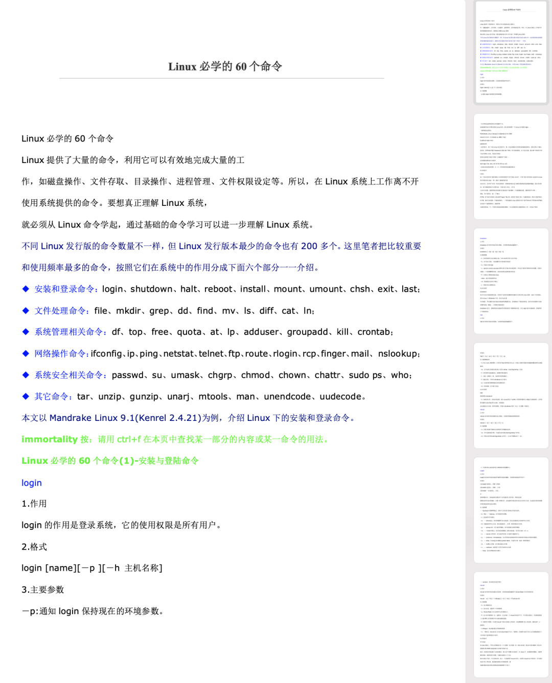 为了解决这个问题,我们对常见的Linux命令进行了系统总结和整理,以便在需要时能够快速地找到相关命令。我将重要且使用频率最高的命令按照它们在系统中的作用分成六个部分进行介绍,涵盖了文件操作、进程管理、网络配置等方面。这个命令清单将帮助你快速掌握常用的Linux命令,提高工作效率和面试表现。想要的粉丝免费送你们。