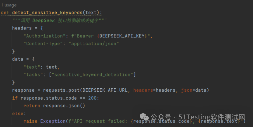 如图所示,通过 requests 库发送 HTTP POST 请求,调用 DeepSeek 的文本分析接口。