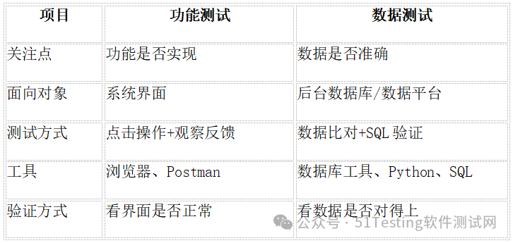 功能测试关注的是“功能是否实现”,而数据测试关注的是“数据是否准确”。