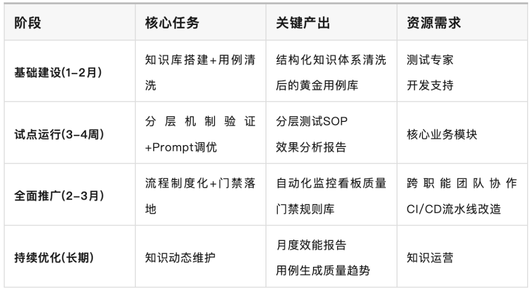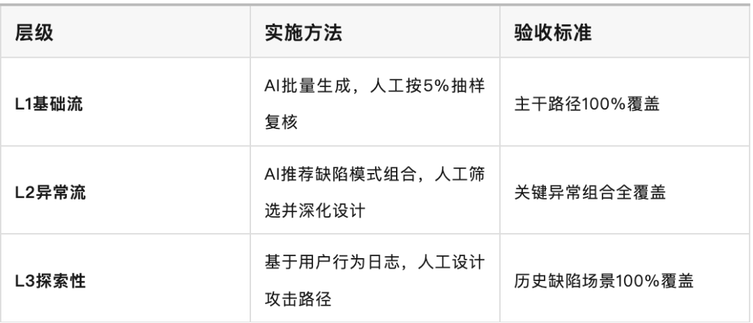 AI生成初稿->业务专家校验业务逻辑->测试工程师补充异常场景->自动化冒烟测试