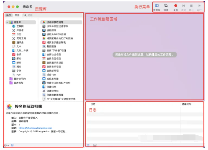 需要我们选择一个文稿类型,随便选择一个即可进入到Automator主界面,如图8-2所示。整个界面可以分为四部分,分别是执行菜单、资源库区域、工作流创建区域和日志区域。