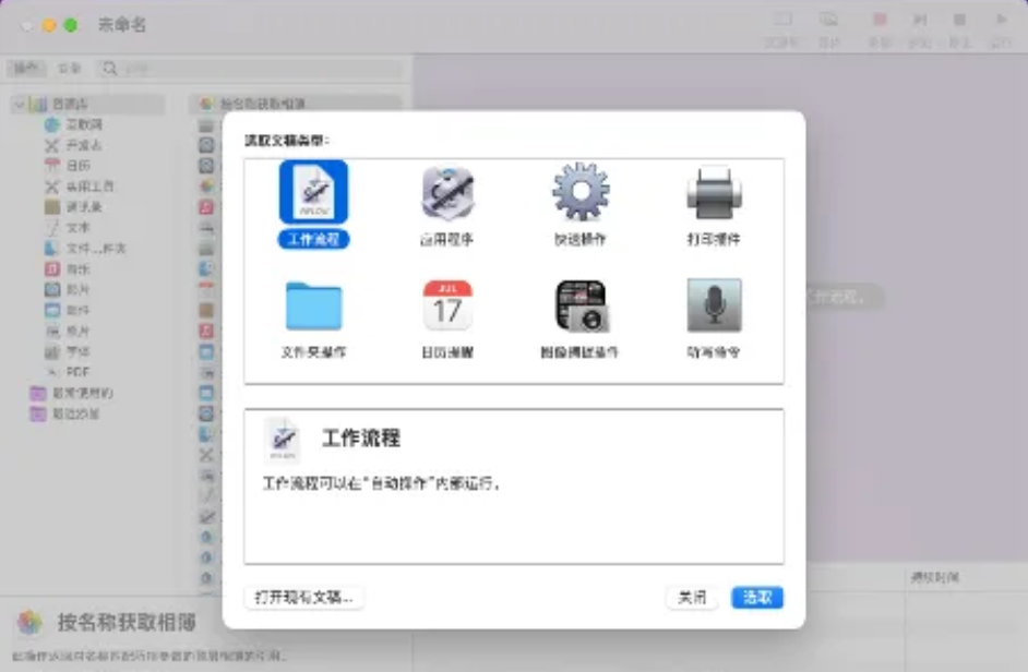 点击小机器人图标启动自动操作Automator程序,启动后进入文稿类型选择界面,截图如图8-1所示。
