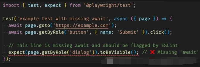 wait page.getByRole('button', { name: 'Submit' }).click();expect(page.getByRole('dialog')).toBeVisible(); // ❌ Missing 'await'