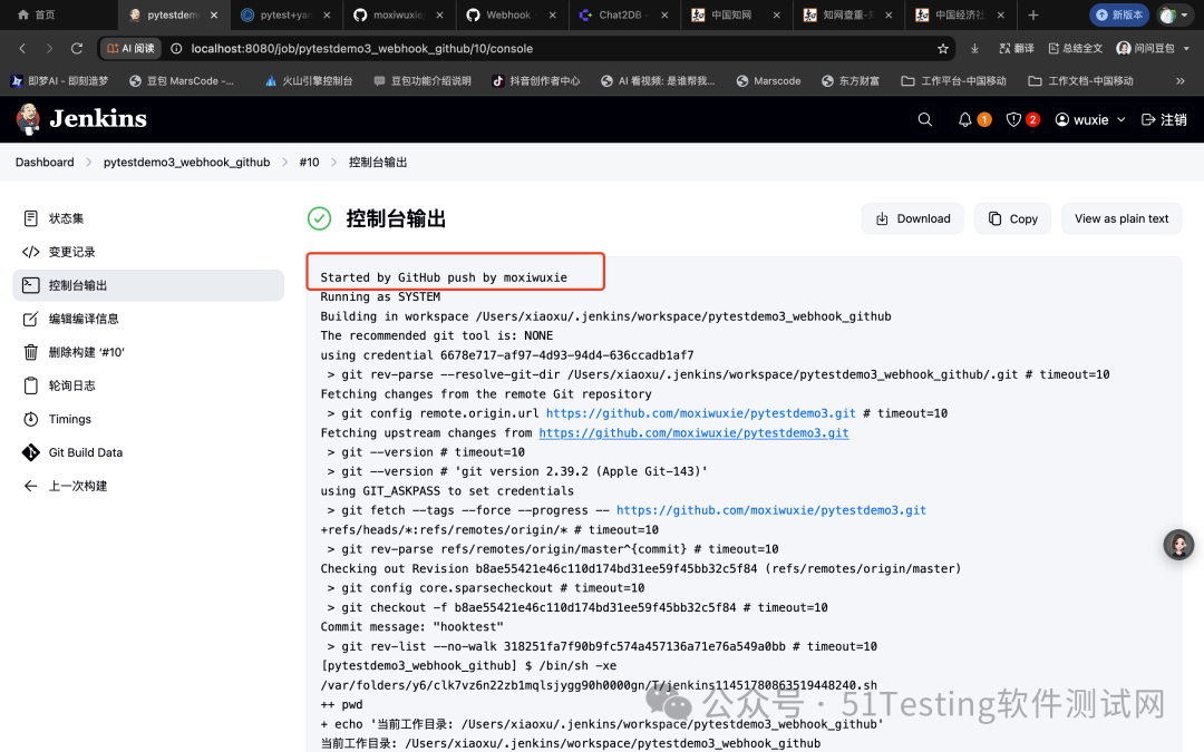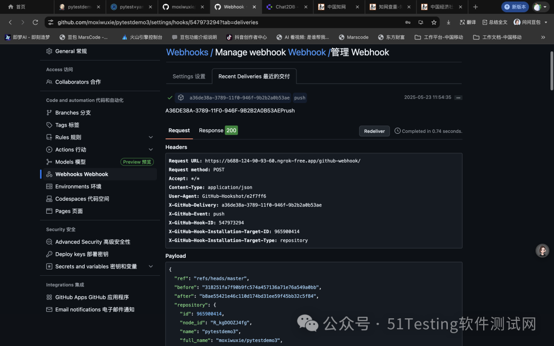 我们可以看到项目被触发构建了。我们再观察一下github中webhook的记录。