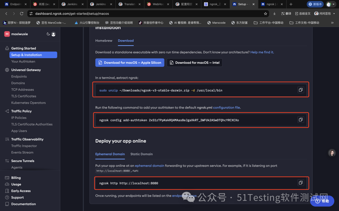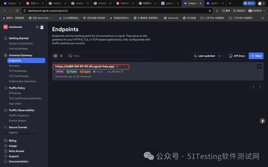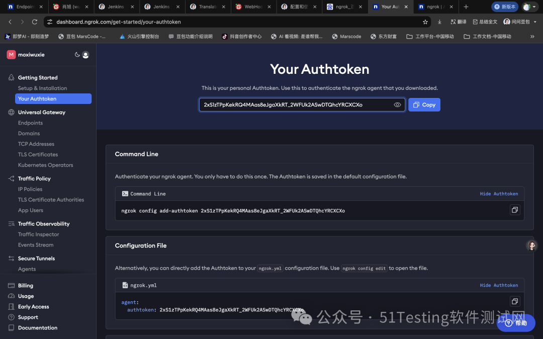 下载好之后,将压缩包在终端解压。再添加ngrok账号所对应的authtoken。最后将本地网址即端口映射到公网上。最后在ngrok中的Endpoints查看公网ip。