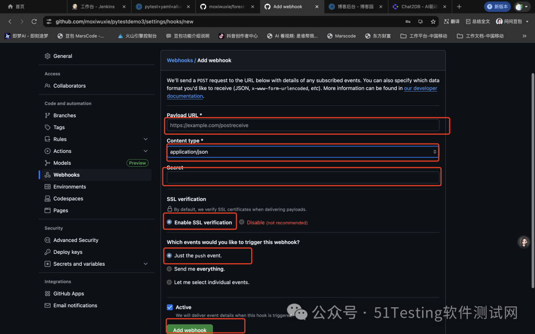 在github平台上进行webhook的创建,根据路径点击add webhook后填入预期参数。