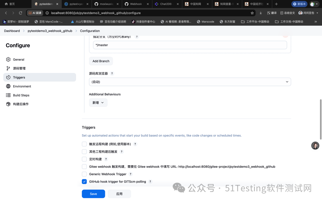 另外要有个目标地址(应用)。这里实际例子是jenkins的webhook地址,这个地址必须是可以被公网访问的地址。我会在文章最后描述一下如何将本地的接口暴露在公网。