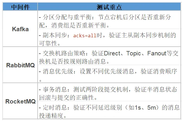 以下是系统化的测试方案,结合常见中间件(如Kafka、RabbitMQ)的特点展开: