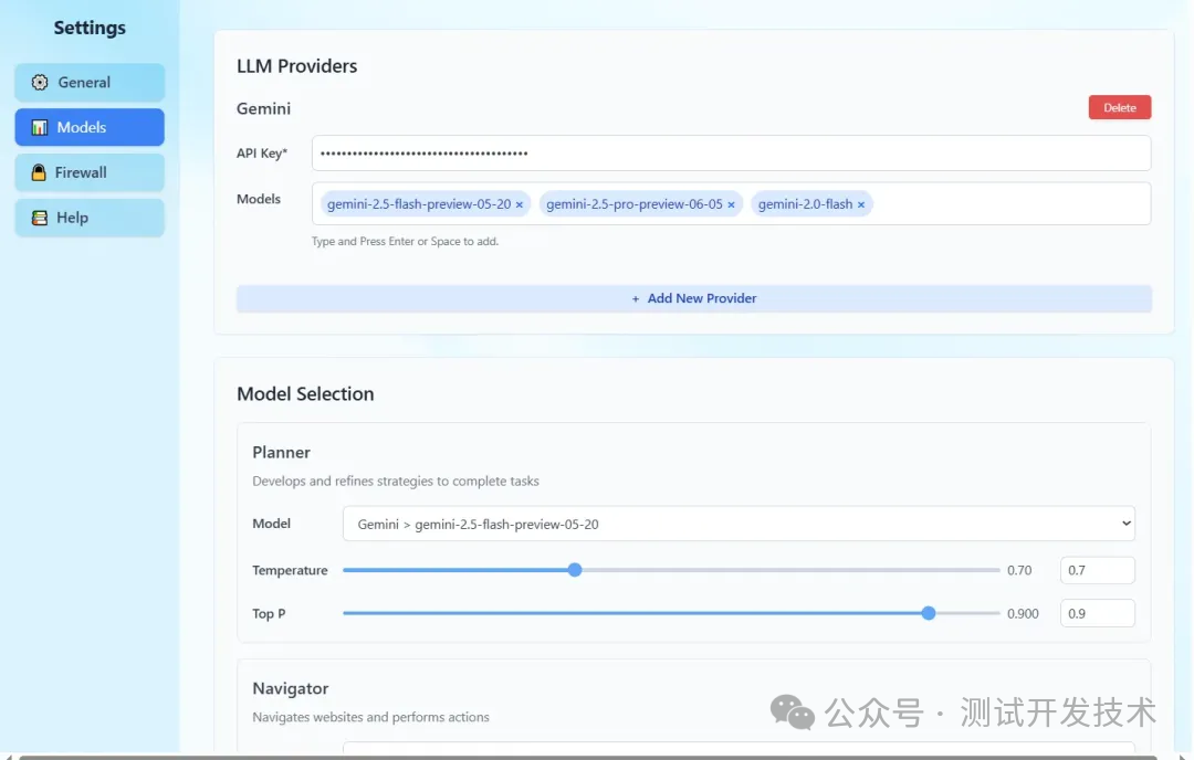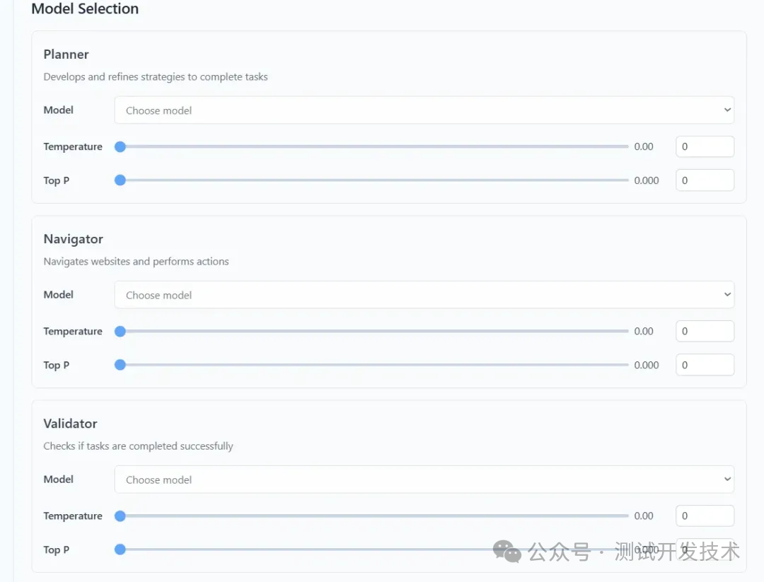 为不同的智能体(如Navigator、Planner、Validator)选择你喜欢的模型(比如Claude 3.7 Sonnet、GPT-4等)。