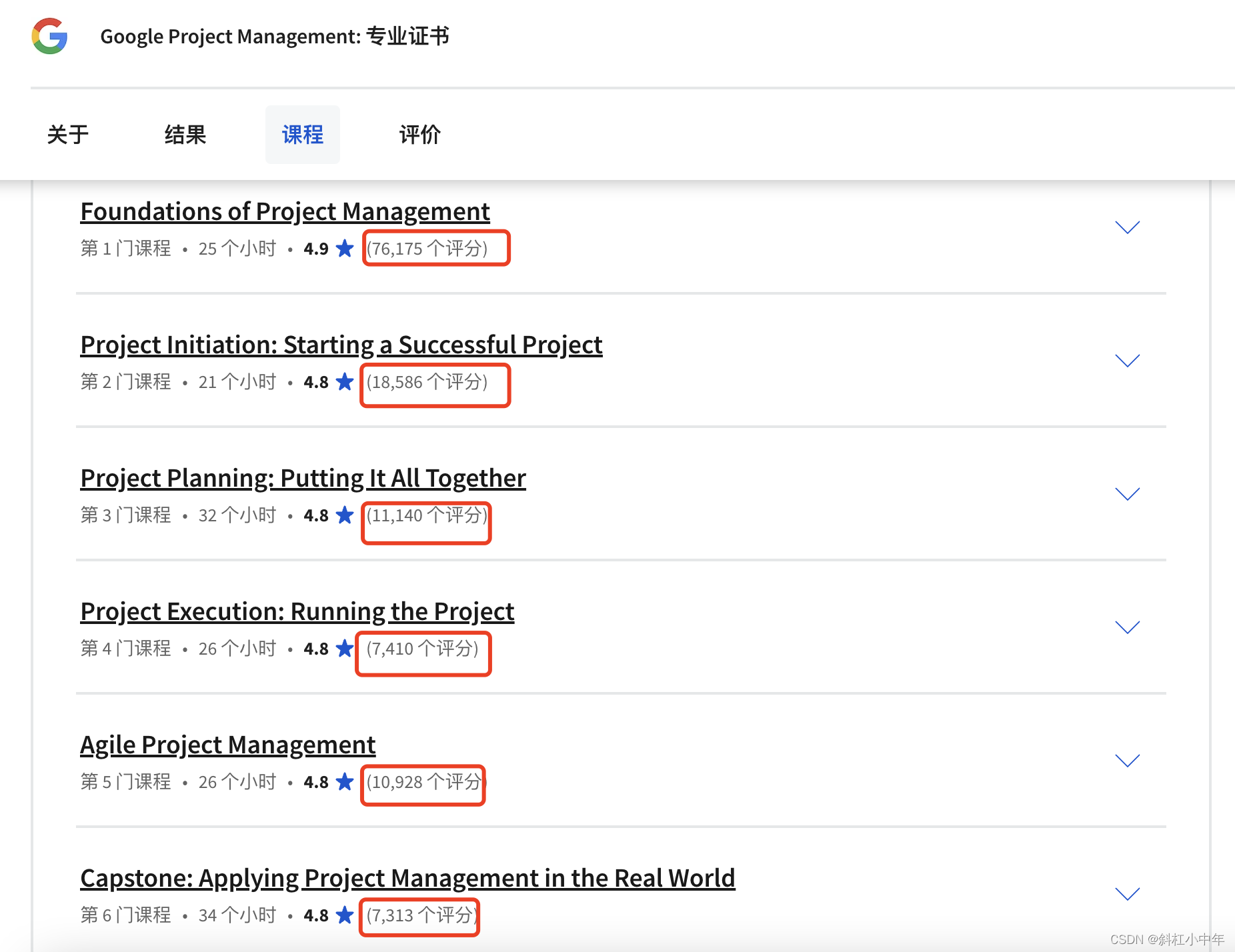 这其中的艰辛可以通过谷歌项目管理每个章节的课程学习人数体现出来,如下图:课程评分人数从第一课的76175个到第六课的7313个,拿到证书的人最终10%不到。
