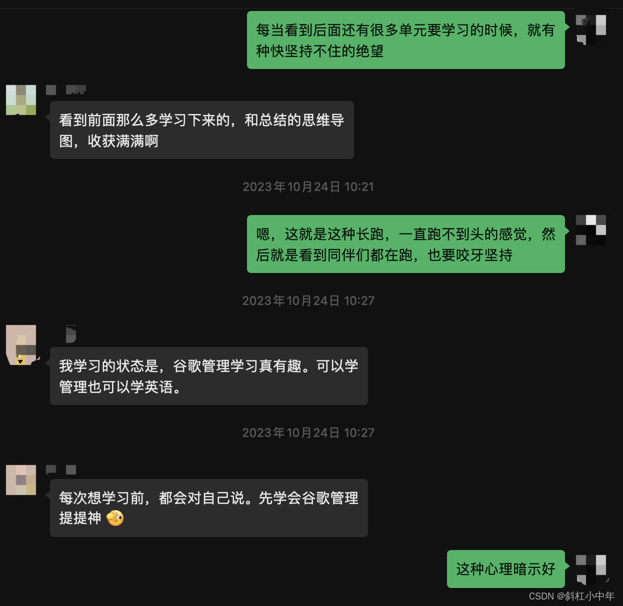 这个场内的老师以及同学对我个人的学习状态都起到关键作用。以下只是其中某一次的对话,类似的激励还有很多。