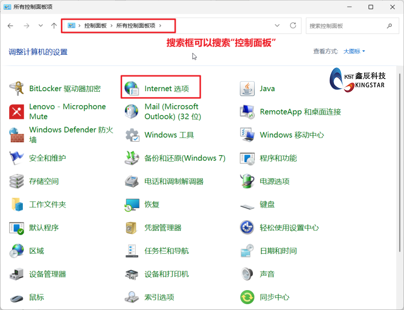 选择Internet选项:在控制面板界面中,找到并点击“Internet选项”。