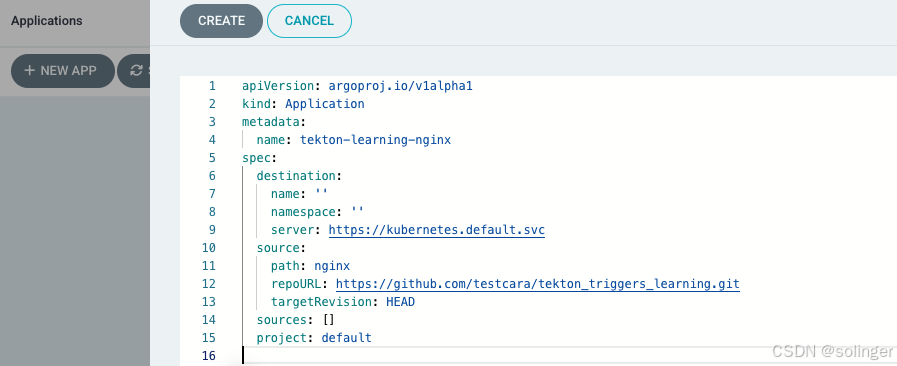 我们在argocd的dashboard点击“New App”,填入相应的字段,也可以“Edit as yaml”进行编写。