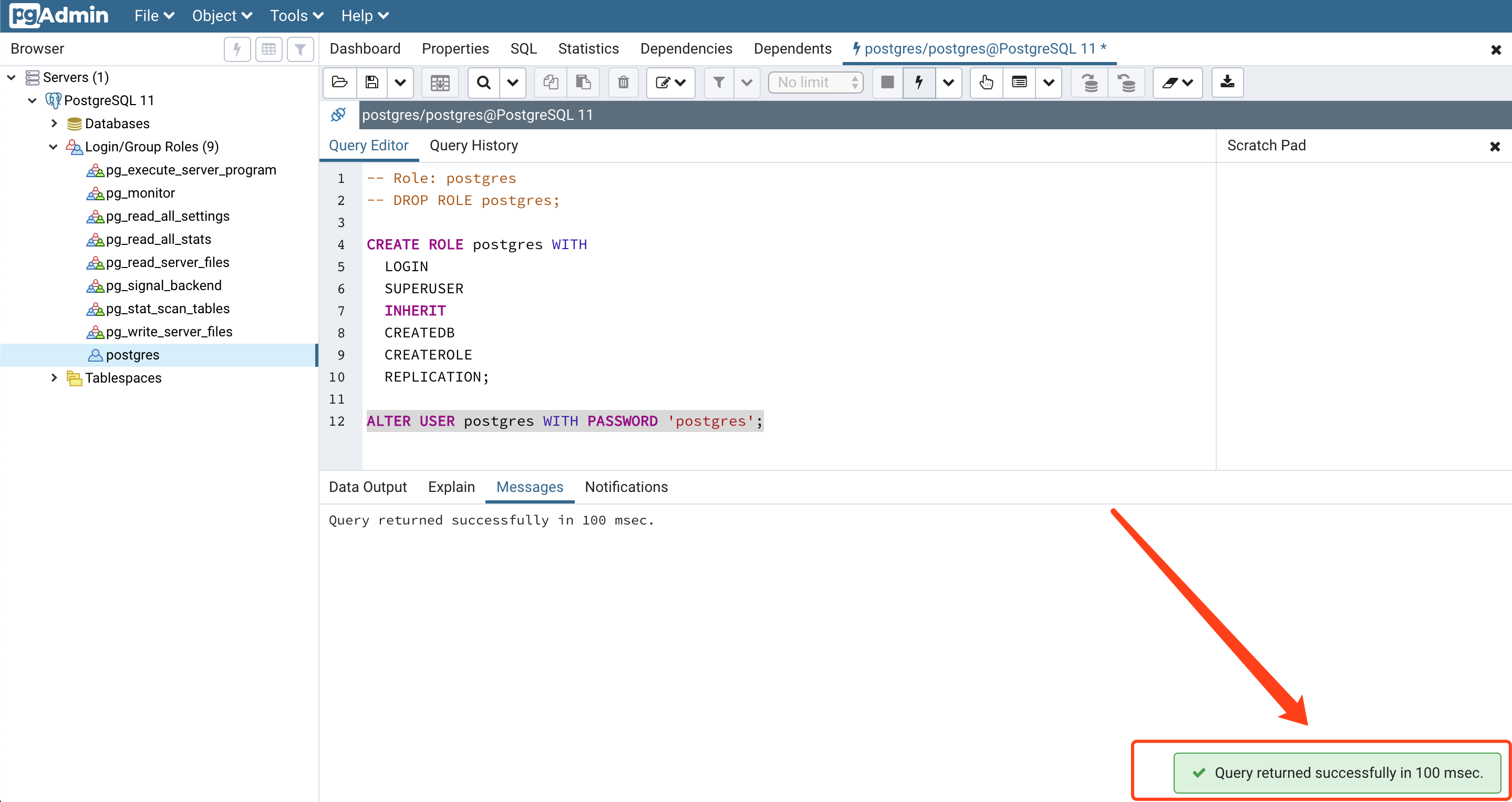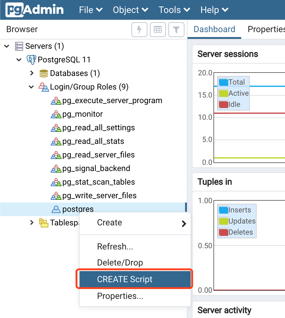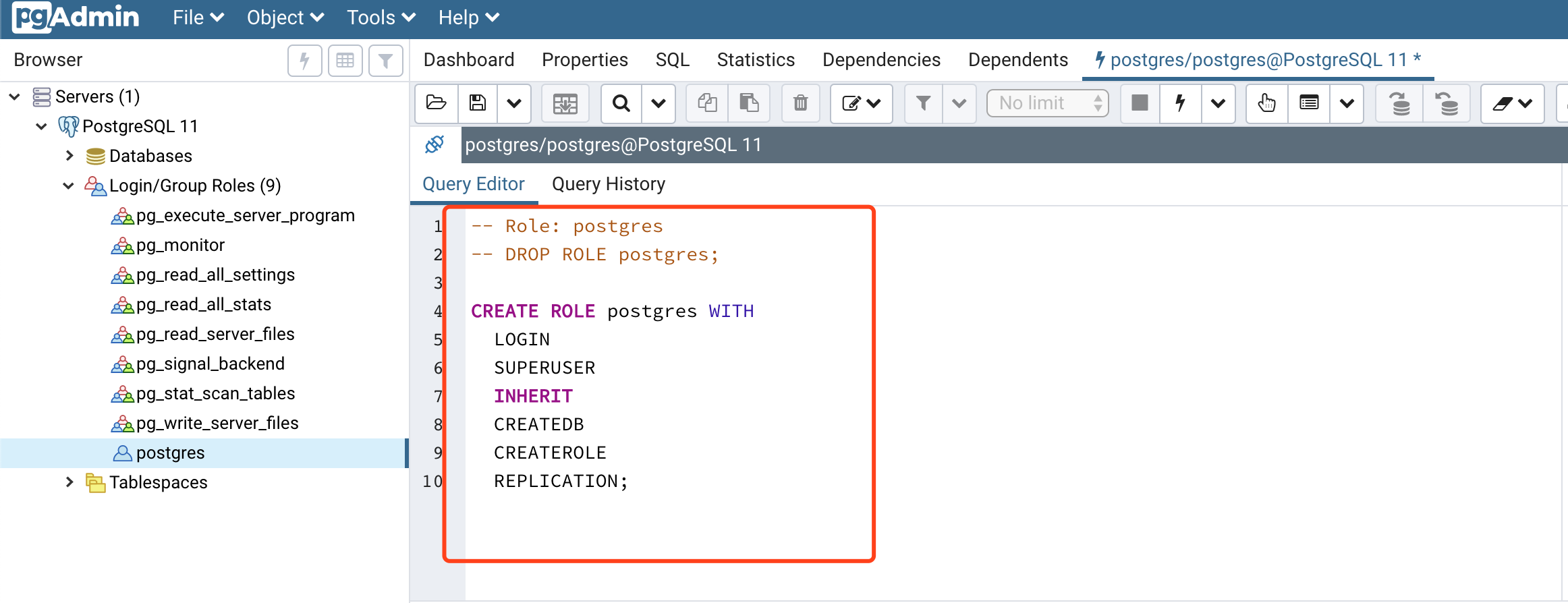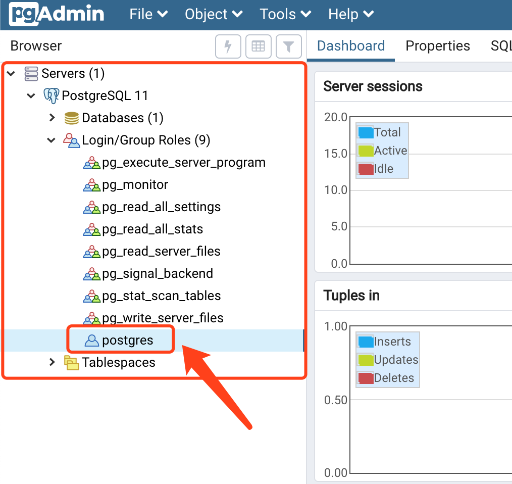 左侧栏目树,依次点开 Servers, PostgreSQL 11, Login/Group Roles, 找到 postgres ,这就是我要改密码的用户名。 postgres 也是数据库默认的用户名,如果你没改过的话。当然如果想改其他用户的密码,在这里都能找到,操作方法一样的。