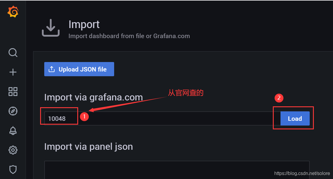输入在官网搜索出来的proxmox 仪表盘ID值10048,然后点击右侧按钮”Load”。