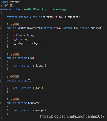 事件引发时,引发事件的对象可能希望向接收事件通知的对象传递一些附加信息。这些附加信息需要封装到它自己的类中,该类型通常包含一组私有字段,以及一些用于公开这些字段的只读公共属性。根据约定这种类应该从System.EventArgs派生。而且类名以EventArgs结束。
