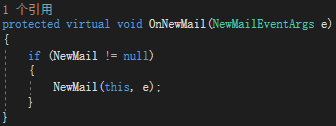按照约定,类要定义一个受保护的虚方法。引发事件时,类及其派生类的代码会调用该方法。方法只获取一个参数,即一个NewMailEventArgs对象,其中包含了传给接收通知的对象的信息。方法的默认实现只是检查一下是否有对象登记了对事件的关注。如果有,就引发事件来通知事件的登记对象。