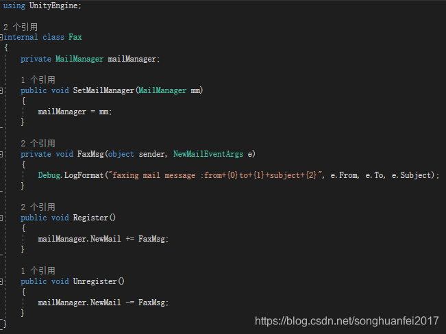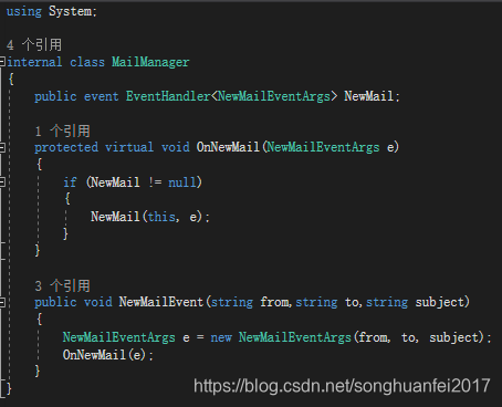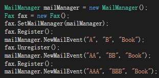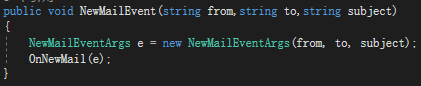 这个方法接收关于邮件的信息并构造NewMailEventArgs对象,将邮件信息传给它的构造器。然后调用MailManager自己的虚方法OnNewMail来正式通知MailManager对象收到了新的邮件。这会导致事件的引发,从而通知所有已登记的方法。