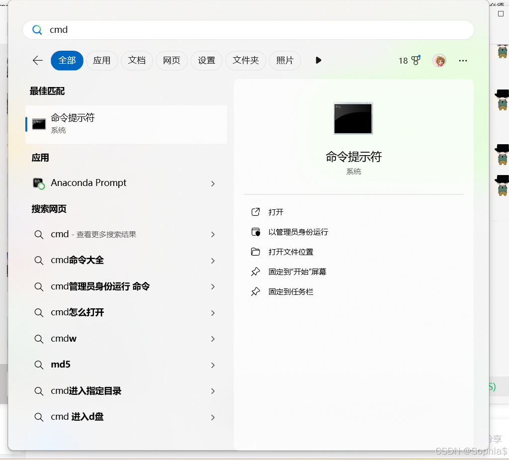 在开始菜单中搜索cmd,选择“命令提示符”。