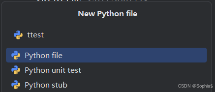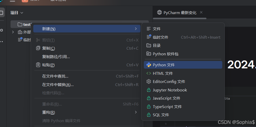 把光标放在“test1”项目上,单击右键,选择“Python文件”,并给python文件起名字为“ttest”,然后回车。