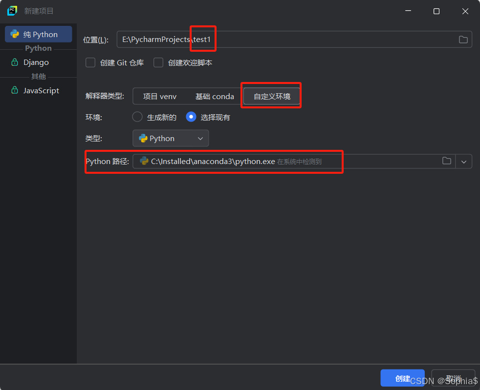 选择新建项目,设置项目的位置和名称(下图中的“test1”就是项目名称),配置解释器。解释器就是我们上面安装的Anaconda里的python.exe。
