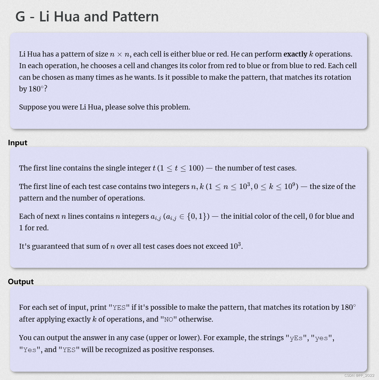 该问题涉及判断一个nxn的图案在进行180度旋转后是否能与原图案匹配。通过遍历上半部分图案并与下半部分对比,计算不同单元格的数量。考虑奇偶性,对中间行进行特殊判断。如果所需操作次数大于给定的k值,答案为NO;否则根据操作次数的奇偶性及图案的对称性决定答案为YES或NO。