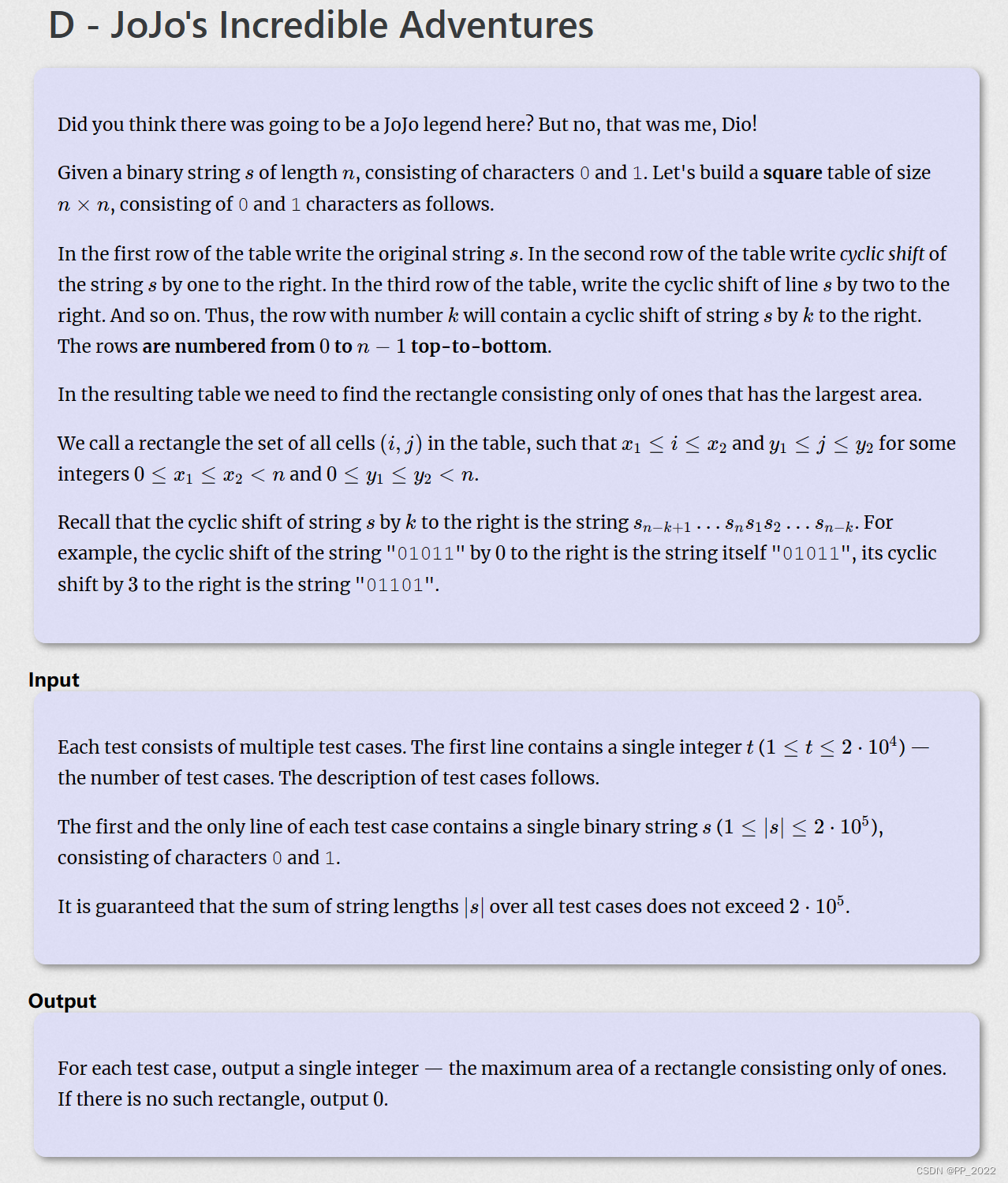 有一串由 0,1 构成的字符串,每次循环右移一位,行编号从 0 一直到 n-1。求这些行里由 1 构成的最大矩形面积。