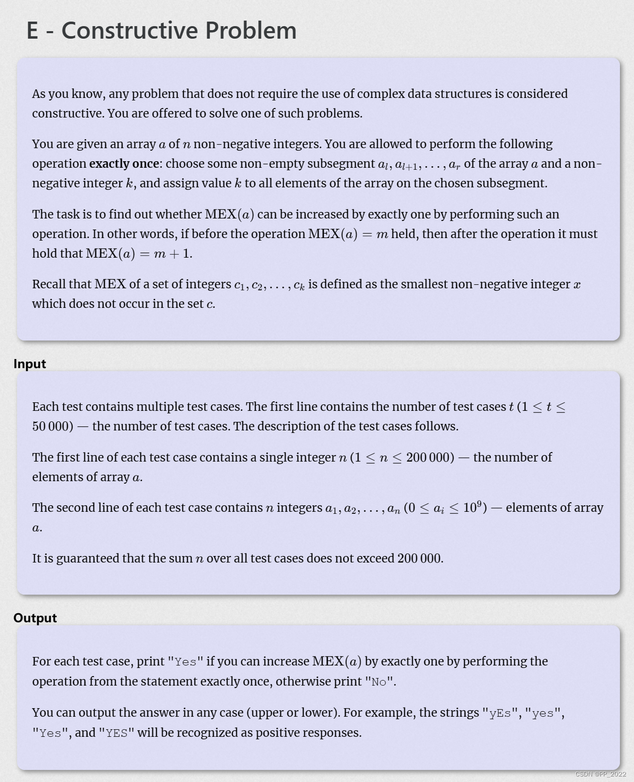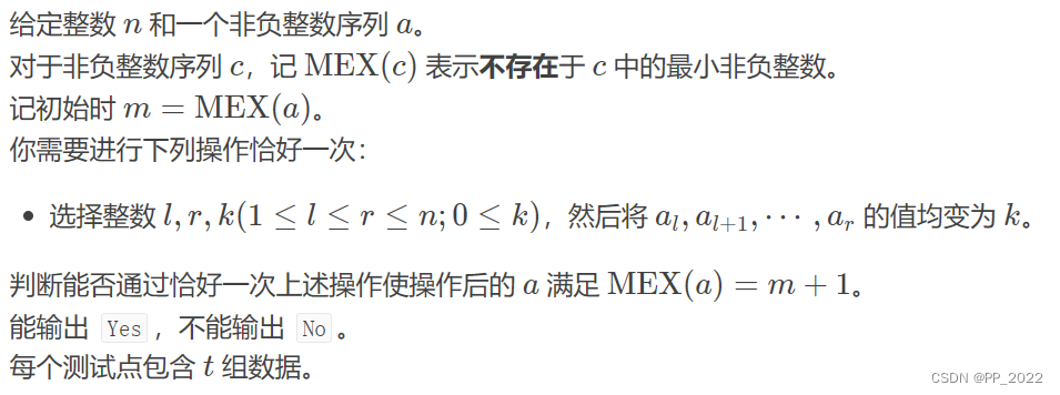 - 如果数组中每个元素都对MEX值有贡献(数组是 0,1,2,⋯,MEX-1 的一个排列),则答案是NO。