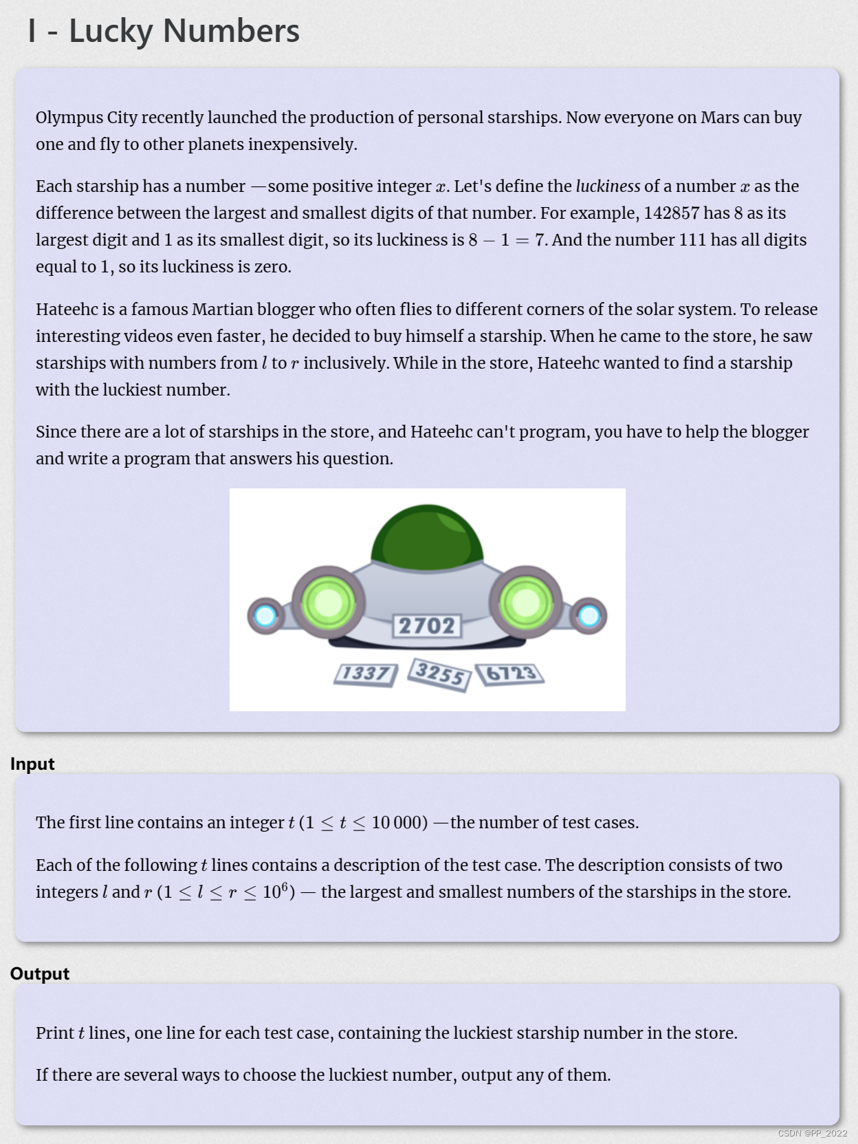 奥林巴斯城最近推出了个人星舰的生产。现在火星上的每个人都可以买一个,然后以低廉的价格飞往其他星球。每艘星舰都有一个数字正整数z。让我们将数字z的幸运度定义为该数字的最大数字和最小数字之差。例如,142857的最大数字是8,最小数字是1,所以它的幸运度是8 - 1 = 7。数字111的所有数字都等于1,所以它的幸运度是0。Hateehc是一位著名的火星博主,他经常飞往太阳系的不同角落。为了更快地发布有趣的视频,他决定给自己买一艘星际飞船。当他来到商店时,他看到了数字从l到r的星际飞船。在商店里,海蒂想找一艘有最幸运数字的星际飞船。因为商店里有很多星际飞船,而Hateehc不会编程,所以你必须帮助博主编写一个程序来回答他的问题。
