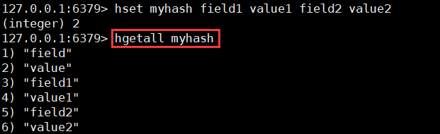hmsetkey field value [k1 v1 [k2 v2 …]] // 批量添加一个 Hash 中的 key 和 value