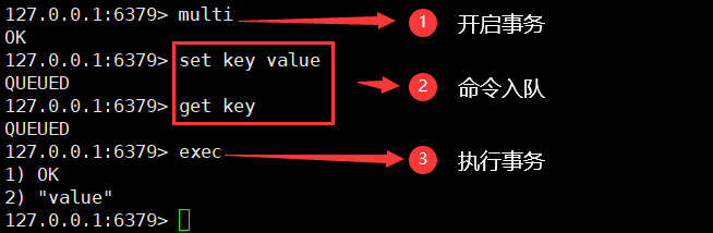 Redis事务本质:一组命令的集合,一个事务中的所有命令都会被序列化,在事务执行过程中,会按照顺序执行!