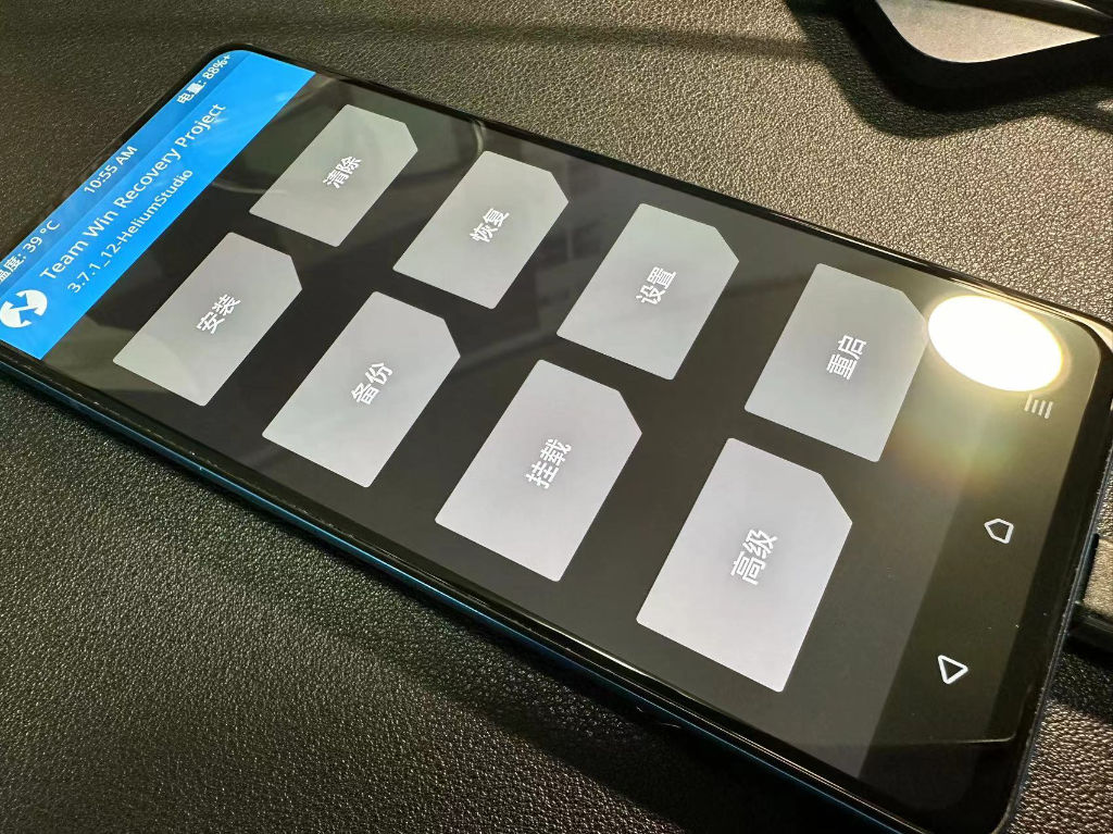 最后,长按关机键盘和音量键上,我们就能够看到你刷入的指定版本的 TWRP 啦。
