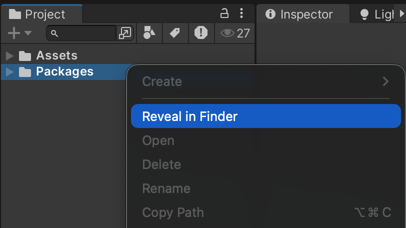 1. 在 Project 窗口中,右键点击 Packages 文件夹,选择 "Reveal in Finder" (Windows 下为 "Show in Explorer")。