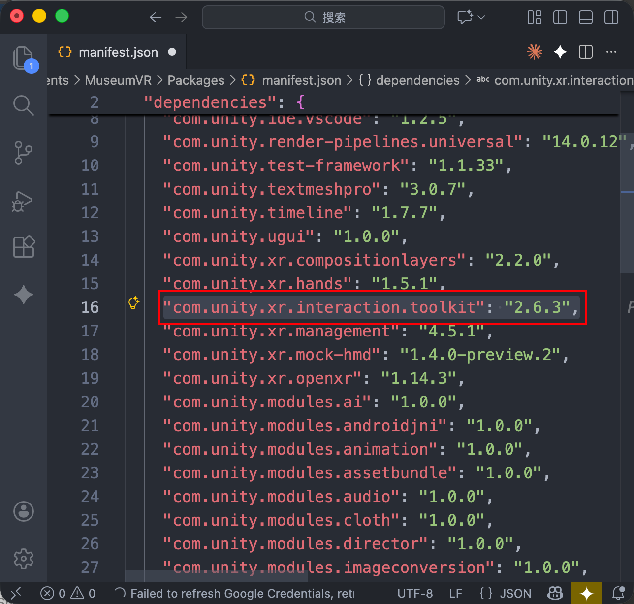 3. 在清单中找到目标 Package 的名称(例如 com.unity.xr.interaction.toolkit),将其冒号后的版本号手动修改为目标版本。例如,将 XRI 版本选定为 2.6.3,做如下修改:
