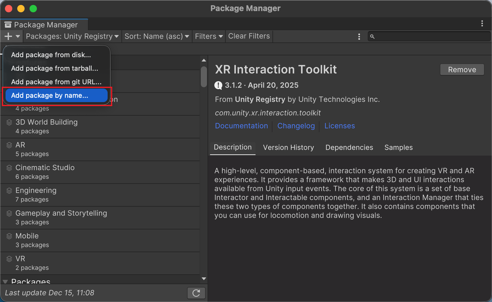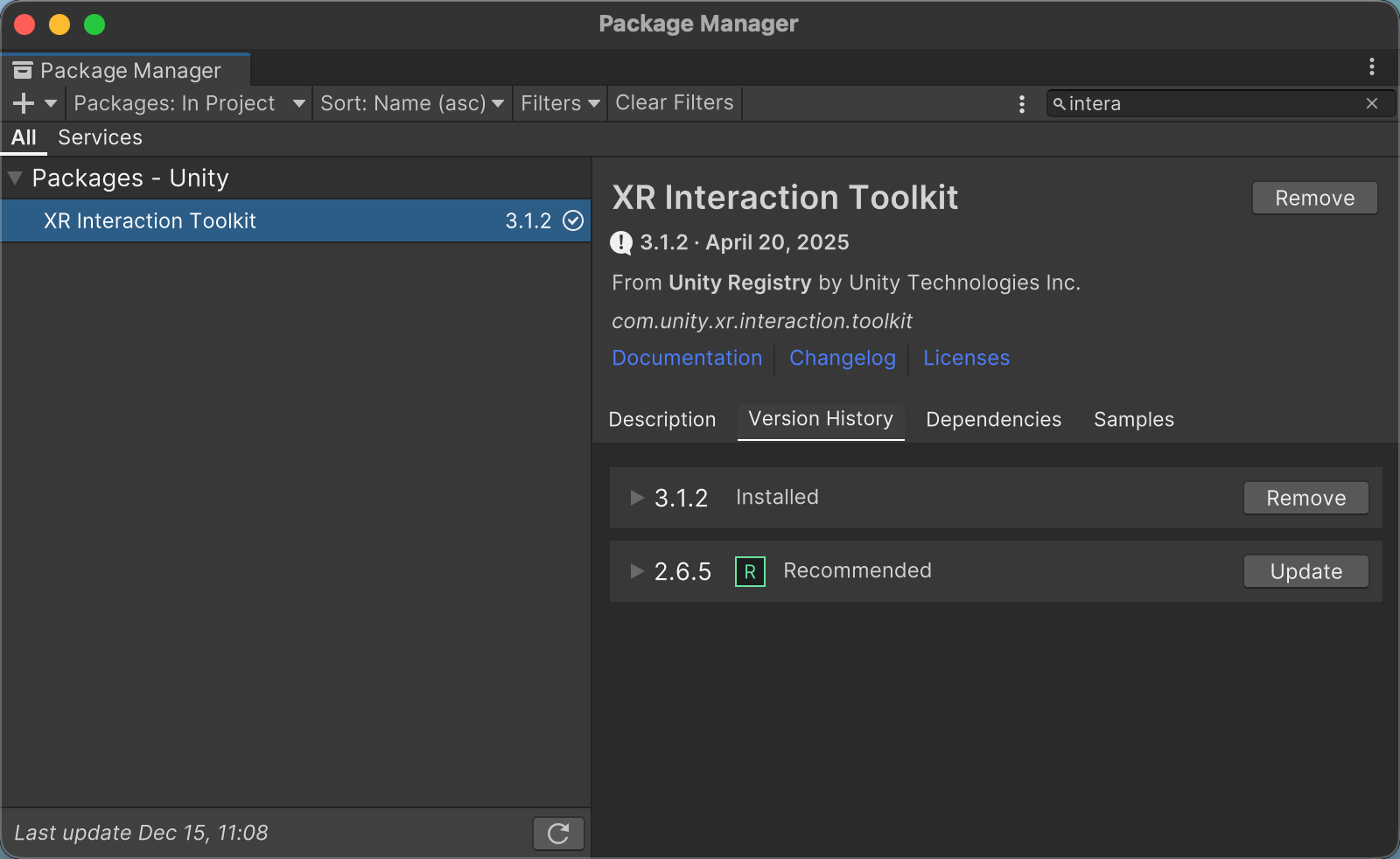 提示:此列表通常只显示提供有限数量的版本,如下图所示,以Interaction Toolkit为例,仅提供一个降级选项2.6.5,且没有提供升级选项如3.3.0等较高版本。若找不到所需版本,请参考以下方法。