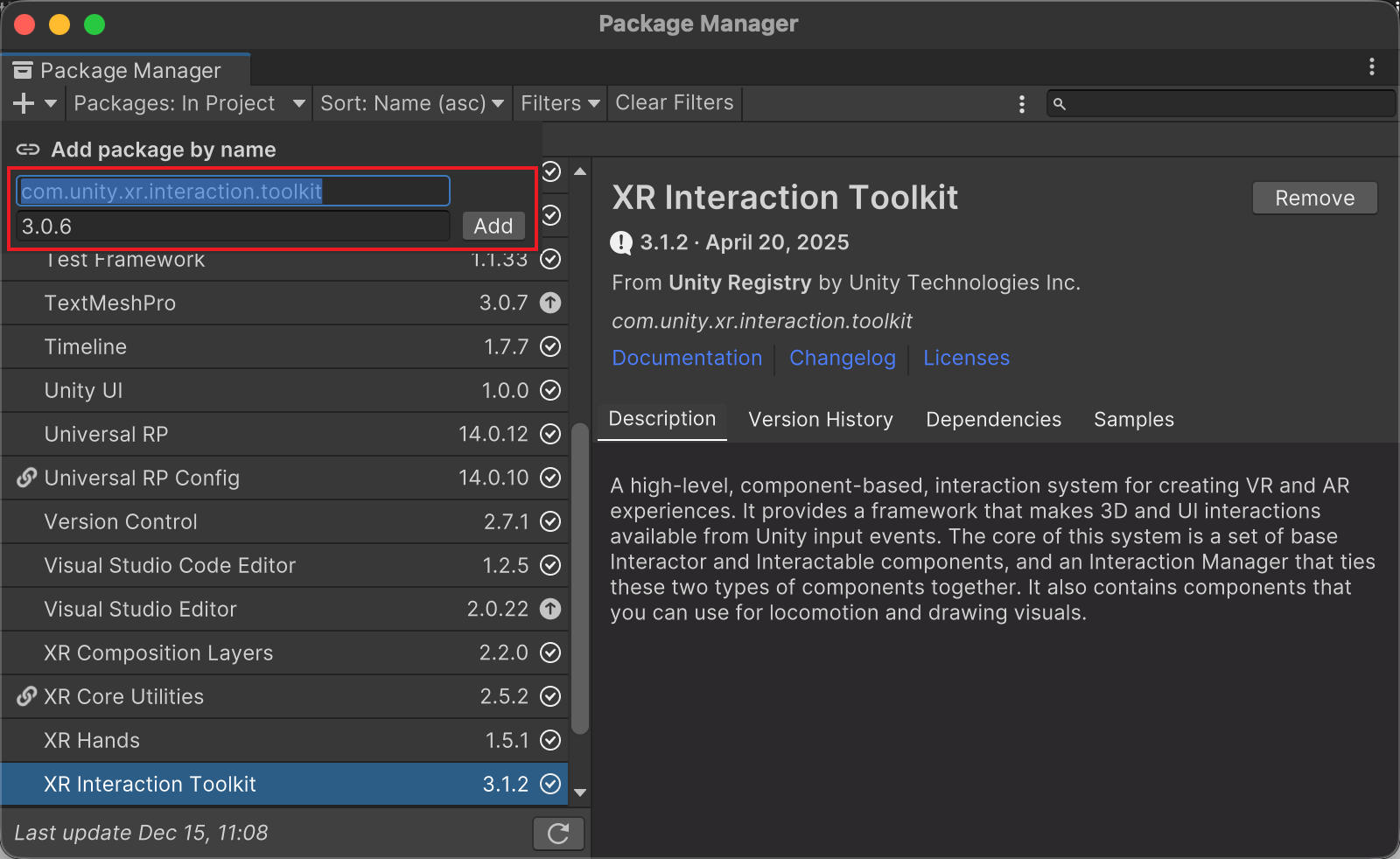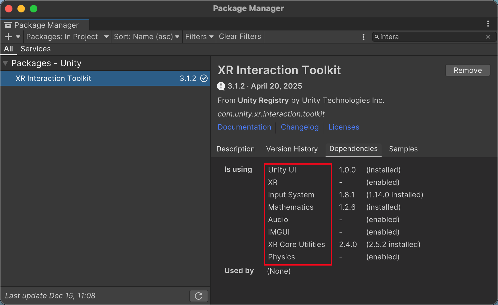 依赖链条:包与包之间也存在依赖关系(例如 XRI 可能依赖特定版本的 Input System等)。强行修改某一个包的版本,可能会导致整个依赖链断裂。关于包间依赖关系,可在工具包详情页中的Dependencies标签页查看,如下图所示: