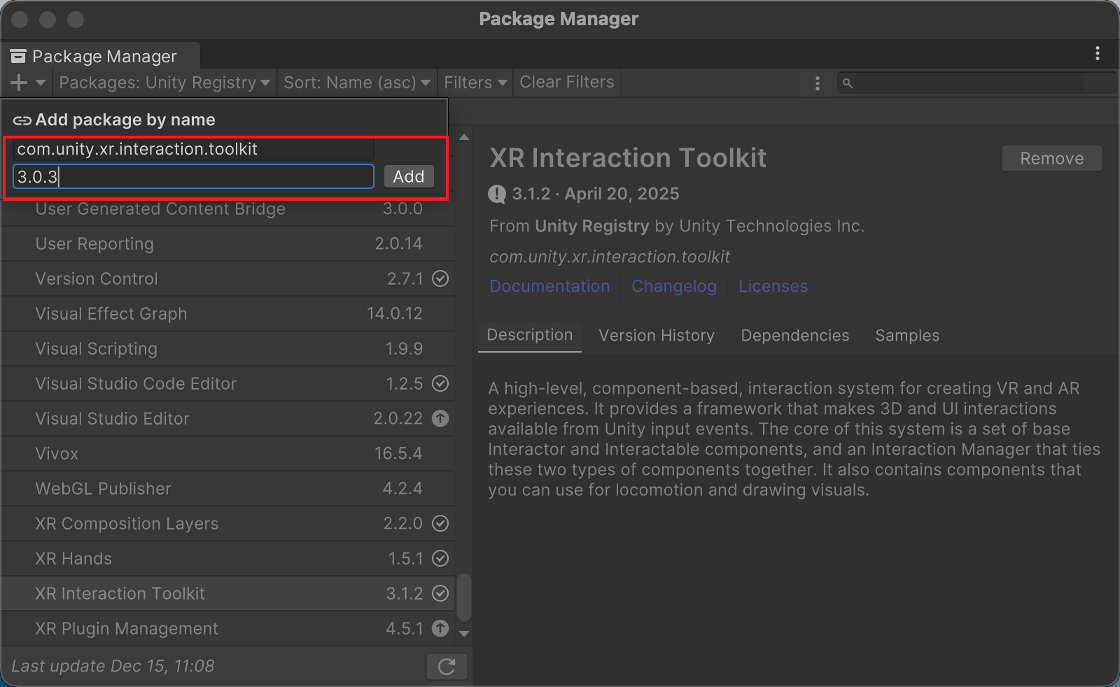 老旧项目维护:接手或复现一个两年前的项目时,新版Package往往会导致兼容性报错,比如 XRI 2.x 升级到 3.x 的架构断层、API结构不兼容等。当老项目架构对旧版本Package开发依赖严重时,此时回退到旧版本往往是更高效的解决方案。