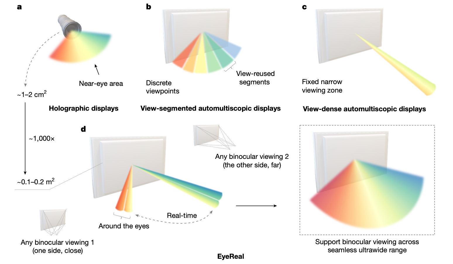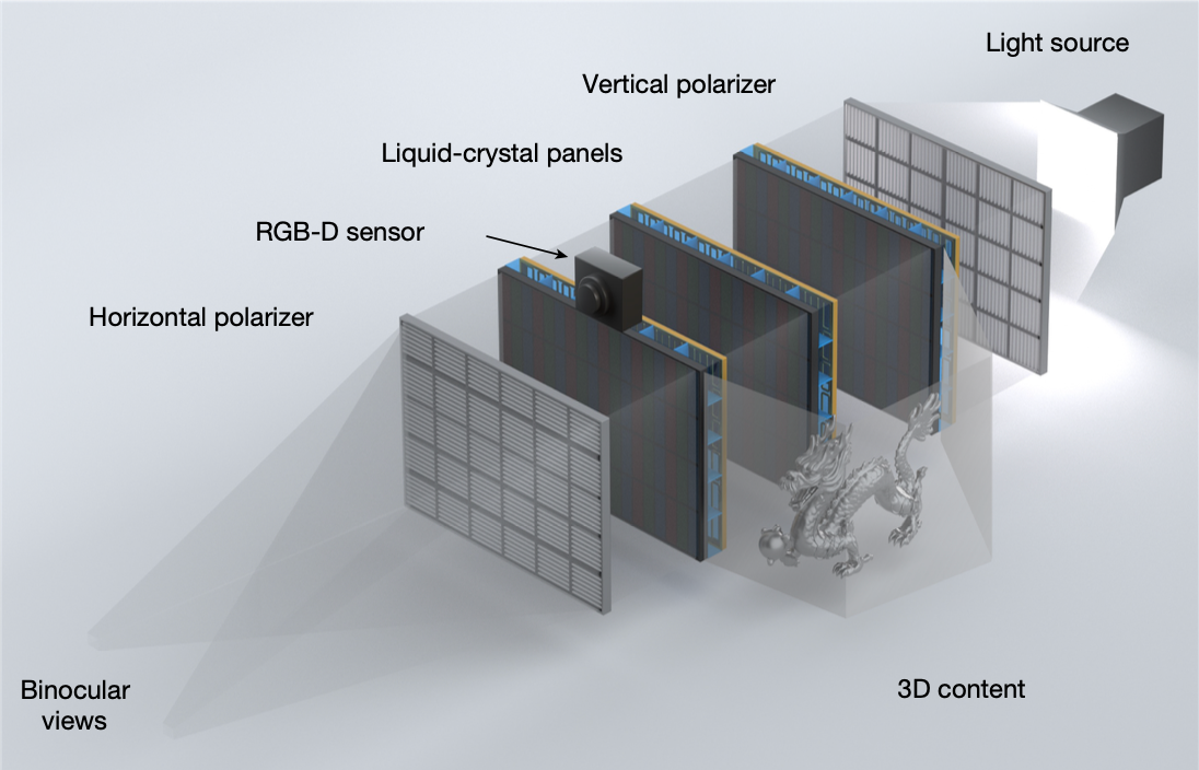 该研究提出了一种基于“计算显示”的全新范式,通过按需生成光场(注:光场是指空间中所有位置、所有方向的光线集合),成功突破了制约传统裸眼3D长达数十年的“空间带宽乘积(SBP)”物理极限,最终在桌面级尺度下,实现了兼具高清晰度与超过100度连续视场角的沉浸式无穿戴显示。