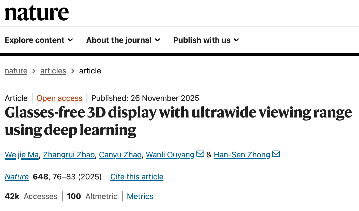 最近几天,裸眼3D领域迎来里程碑突破,复旦大学26岁博士生马炜杰以独立一作身份在《Nature》发表研究成果《Glasses-free 3D display with ultrawide viewing range using deep learning》(使用深度学习的超宽视角无眼镜3D显示)。