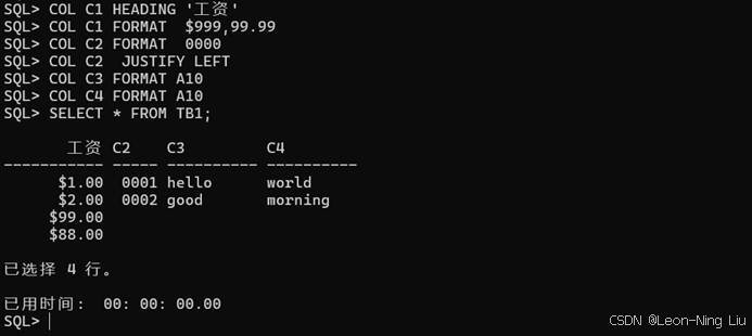 COLUMN sal HEADING '工资' -- 将sal列标题改为中文"工资"