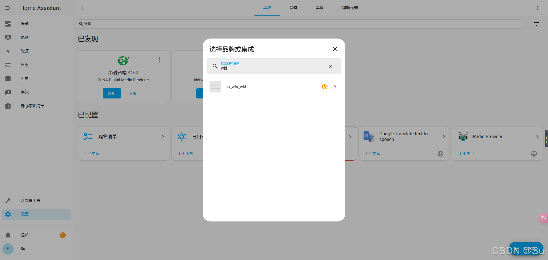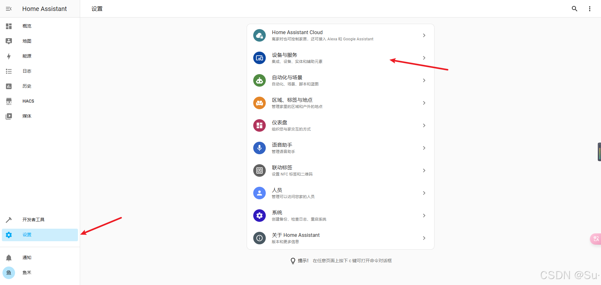 接下来到Home Assistant的web界面,设置-设备与服务中去添加集成