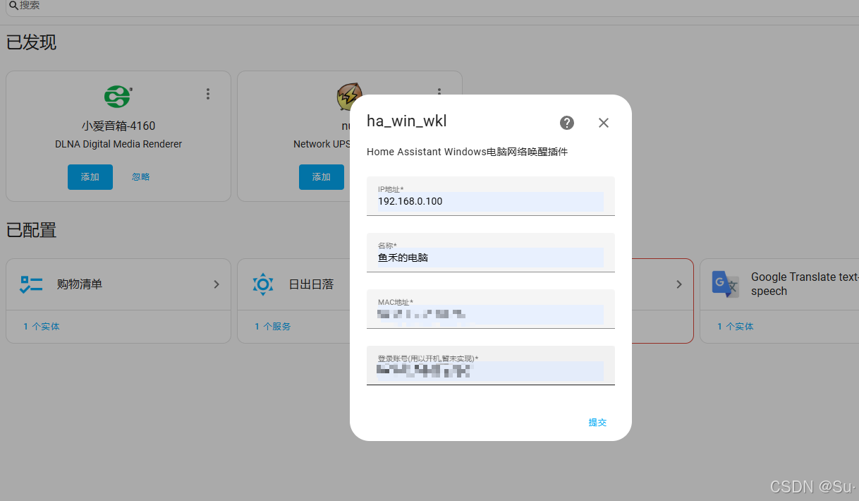 Home Assistant局域网唤醒电脑,目前仅支持开机 因无时间解决shh读取公钥的权限问题,暂时不支持关机功能,建议使用向日葵进行远程关机