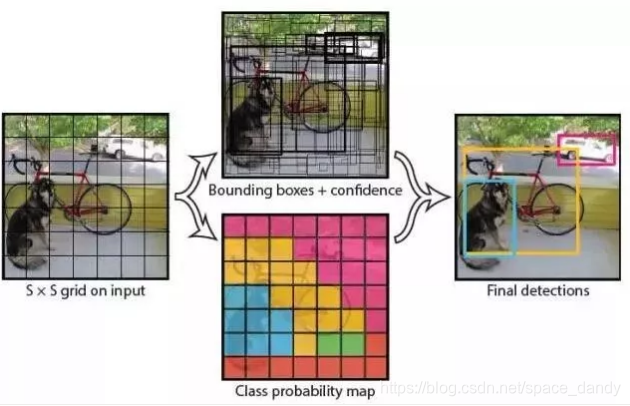 - 对每个网格均预测两个边框(包括了每个边框是目标的置信度和边框区域在多个类别上的概率)
