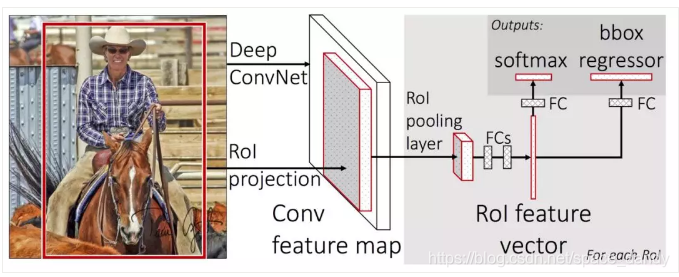 - 与RCNN相比,FastRCNN在最后一个卷积层后加了一个ROI pooling layer(SPP Net的精简版,SPP Net对每个候选区域采用了不同大小的金字塔映射,ROI pooling layer仅仅下采样到一个7*7的特征图),将不同大小的输入映射到一个固定尺度的特征向量。