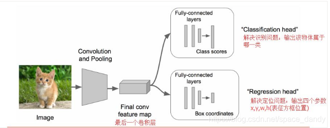 (1)当做回归问题进行处理,预测(x,y,w,h)四个参数的值,得到方框的位置: