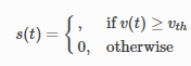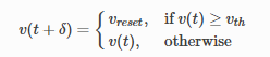 神经元的输出为二值和瞬时的,,当v达到阈值vth时,神经元输出才输出1,同时膜电位立即重置为vreset(该值小于阈值vth)。因此v可以表示为: