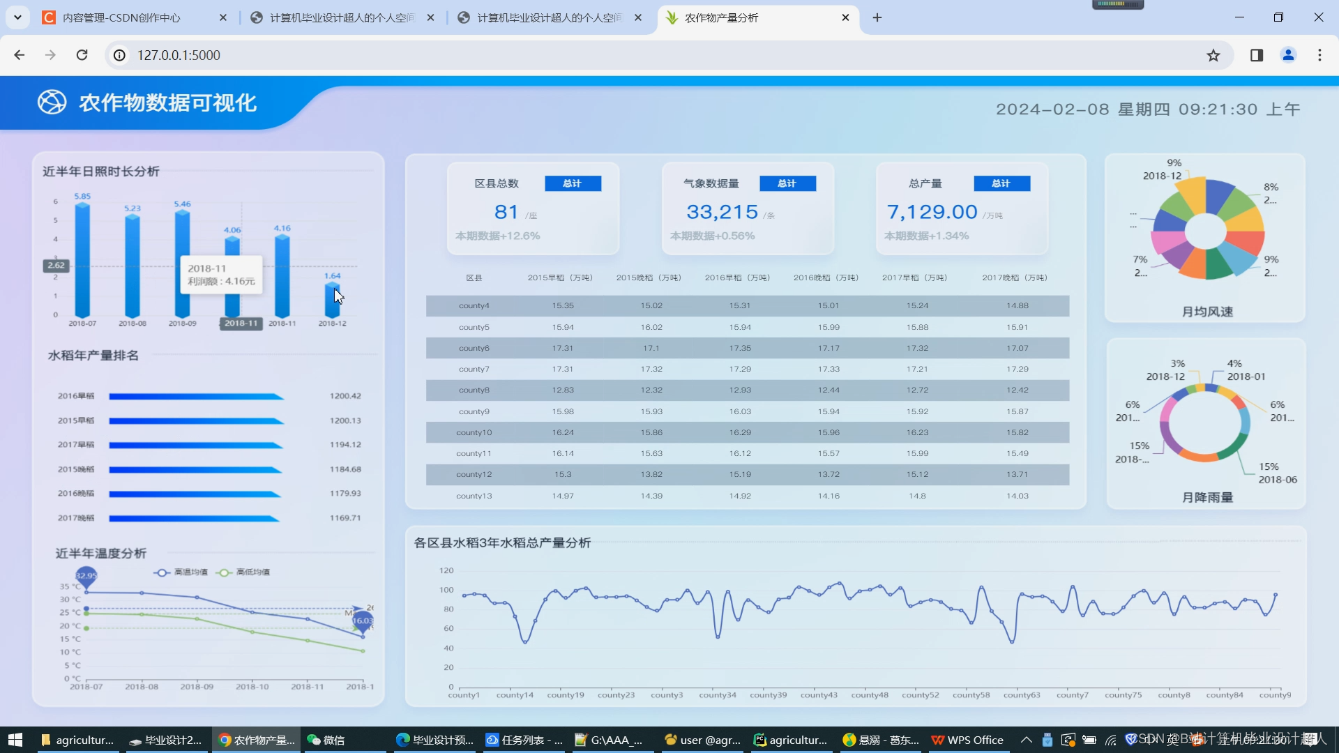 农作物产量大屏数据可视化模块主要利用了Echarts、Ajax、Flask和PyMysql等技 术来实现。Echarts是一个基于JavaScript的可视化图表库,它提供了丰富的图表类型 和灵活的配置选项,能够帮助我们快速、直观地展示数据。在本系统中,我们使用Echarts 实现了各种图表的绘制,包括折线图、饼图、柱状图等,以便更好地展示农作物产量相 关的数据信息。在前端方面,我们使用了Ajax技术来实现异步数据请求,从而避免了页 面的重载和卡顿,提高了用户的体验。通过调用后端提供的API接口,我们可以获取到 需要展示的数据信息,并利用Echarts将其以图表形式展示出来。在后端方面,我们使 用了Flask和PyMysql来实现数据的存储和查询。Flask是一个轻量级的Web框架,它提供 了简洁而灵活的路由和视图函数机制,能够帮助我们快速构建API接口。PyMysql是 Python下的Mysql驱动程序,它提供了丰富的数据库操作接口,能够方便地进行数据的