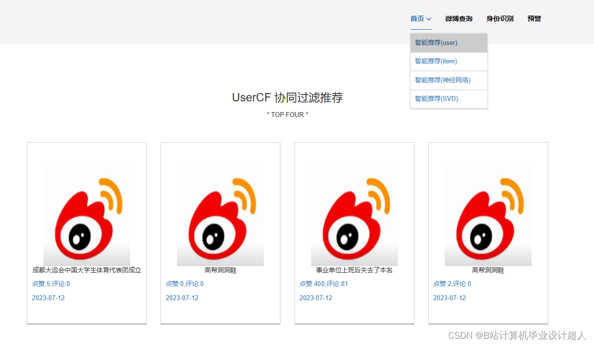 (6)舆情情感分析预警系统预期对微博的新闻头条和热搜排行进行自动采集,进行对话题热度的趋势变化和发布分析,对网民的热点评论数据进行情感分析,得出最近热点关键词,输入关键词后可对该关键词有关的微博消息进行评估预警,提醒使用者以便于做出应对措施。